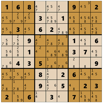 Notes:Il est courant d'utiliser des notes (également appelées annotations) pour représenter des nombres possibles. L'image ci-dessous montre ces notes, indiquées par les petits chiffres. Par exemple, regardez la toute dernière cellule (en bas à droite). Le joueur a déterminé que seuls les nombres 1, 4, 5 ou 8 peuvent être placés dans cette cellule, et a donc mis ces nombres sous forme de notes temporaires.