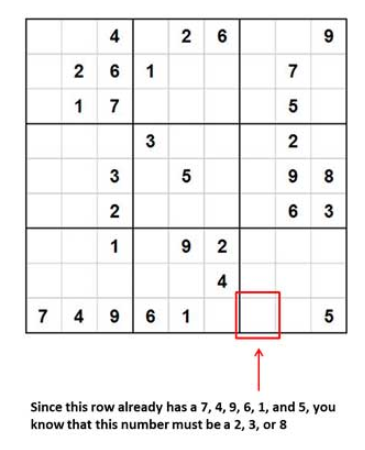 Cherchez les nombres manquants: Sudoku consiste à placer des nombres là où ils n’existent pas déjà - c’est un processus logique d’élimination. Si un nombre existe déjà dans une ligne ou un carré, ce nombre ne peut pas être replacé. Votre défi est de garder réfléchir et rechercher et repérer les opportunités d'ajouter des numéros là où ils n'ont pas déjà été placés.